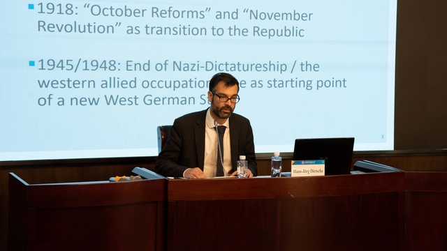 讲座上,Dietsche教授首先介绍了德国《基本法》的起源,及1849年与1919年两部宪法制定的历史背景,并为在座听众细致解读了1949年《德国基本法》的框架结构。在此基础上,Dietsche教授回顾了《德国基本法》的历次修正过程及社会政治背景和历史意义,着重分析了德国《魏玛宪法》失败的原因,并将其与1949年《德国基本法》作了详细的比较分析。他指出,随着法律技术性规范的增加,政治性条款也越来越多,《德国基本法》中的基本权利目录变得越来越繁复,这种趋势妨碍了《基本法》作为创造性文件的根本作用。Dietsche教授认为,所有公民,而不仅仅是法学专家,都应能无障碍地阅读和理解宪法,这是德国社会持续广泛接受《基本法》,并将其作为德国法治基石的重要原因。
