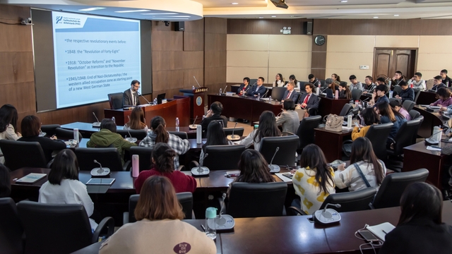 2019年11月11日,德国基民盟/基社盟议会党团法务专家Hans-Jörg Dietsche教授作客上外“区域与国别法”讲坛,为法学院师生带来了题为“《德国基本法》的基本结构及其对德国国家秩序和社会秩序的意义”的精彩讲座。讲座前,法学院院长张海斌会见了Dietsche教授一行。德国阿登纳基金会上海代表处主任马守福(MatthiasSchäfer)、德国驻上海总领事馆文化处、新闻处处长韩茂良(Maximilian O.Hallensleben)、上外中德人文交流研究中心副主任毛小红等出席讲座并参与讨论。