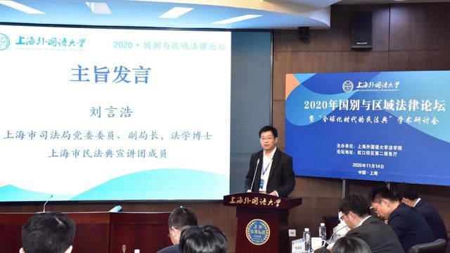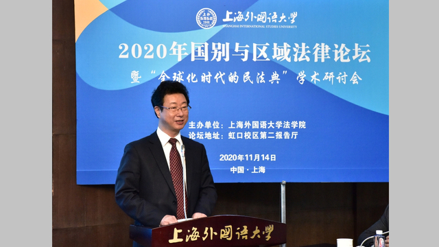1114日,上外法硕2020年国别与区域法律论坛暨全球化时代的民法典学术研讨会在虹口校区第二报告厅举行。副校长查明建教授出席并致辞。上海市司法局党委委员、副局长、上海市民法典宣讲团成员刘言浩,上海法学会民法学研究会常务副会长、华东政法大学法律学院院长金可可教授,上海法学会民法学研究会副会长、复旦大学法学院副院长李世刚教授,上海法学会民法学研究会副会长、上海财经大学法学院比较民法与判例研究所所长朱晓喆教授以及上外法学院党政领导、法学专业教师和多语种法律硕士研究生等共80余人出席了活动。法学院院长张海斌教授主持论坛开幕式。