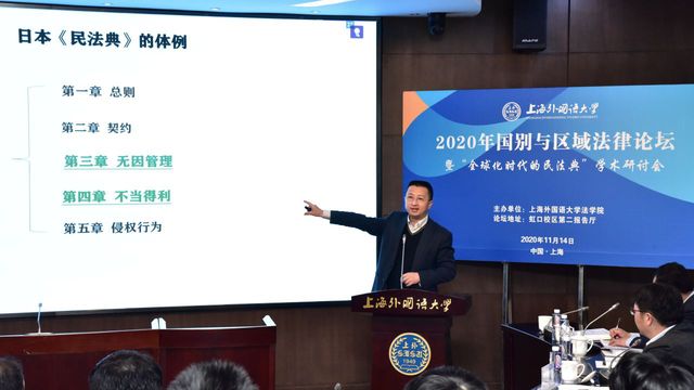 11月14日,上外法硕2020年国别与区域法律论坛暨“全球化时代的民法典”学术研讨会在虹口校区第二报告厅举行。副校长查明建教授出席并致辞。上海市司法局党委委员、副局长、上海市民法典宣讲团成员刘言浩,上海法学会民法学研究会常务副会长、华东政法大学法律学院院长金可可教授,上海法学会民法学研究会副会长、复旦大学法学院副院长李世刚教授,上海法学会民法学研究会副会长、上海财经大学法学院比较民法与判例研究所所长朱晓喆教授以及上外法学院党政领导、法学专业教师和多语种法律硕士研究生等共80余人出席了活动。法学院院长张海斌教授主持论坛开幕式。