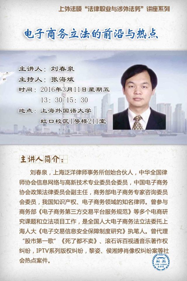 刘春泉,上海泛洋律师事务所创始合伙人,中华全国律师协会信息网络与高新技术专业委员会委员,中国电子商务协会政策法律委员会副主任,商务部电子商务专家咨询委员会委员,我国知识产权、电子商务领域的知名律师。曾参与商务部《电子商务第三方交易平台服务规范》等多个电商研究课题和立法项目工作,是全国人大电子商务法立法委托上海人大《电子交易信息安全保障制度研究》执笔人。曾代理“股市第一歌”《死了都不卖》、滚石诉百视通音乐著作权纠纷,IPTV系列版权纠纷,黎姿、侯湘婷肖像权纠纷案等社会热点案件。